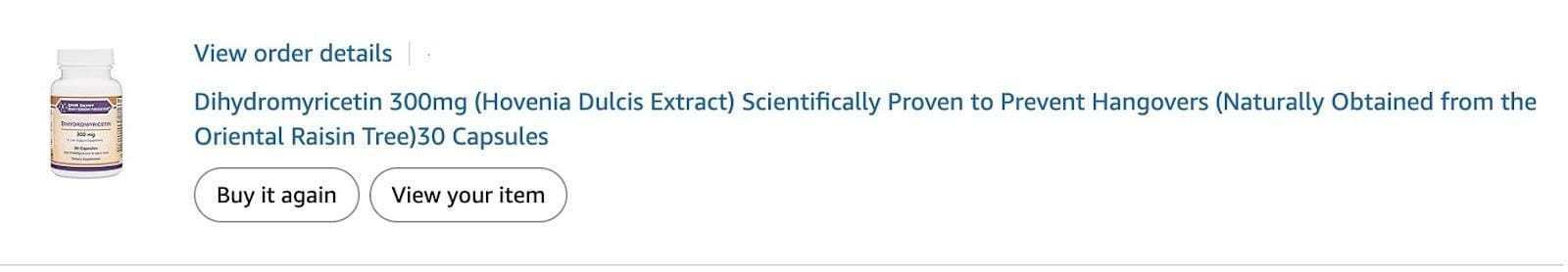 Many (most?) supplements touted as hangover cures include the ingredient Dihydromyricetin (DHM), which, I ain't reading all this, but seems to make rats want to drink less and allows them to roll over more times when they do drink. Cool. I guess I wanted both of those things, or didn't not want them. But, alas, this ingredient made me woozy with a weird taste in my mouth, and I noticed no difference the next day.