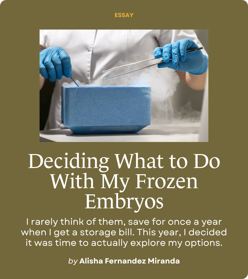 Speaking of expenses, this week’s feature is all about how a recurring bill prompted one woman to finally make a major decision concerning her long-frozen embryos. Read on for that, plus a few recommendations for your weekend.