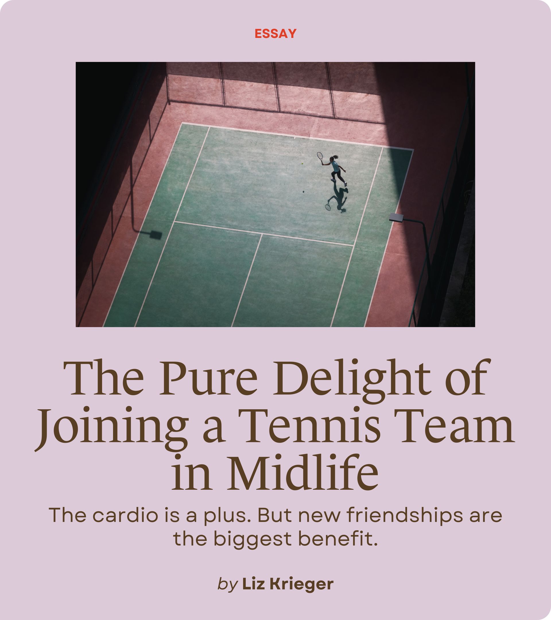 The friendships that form around this shared obsession are also an unexpected boon considering how making new friends at midlife can sometimes feel like an awkward imposition on everyone's already overscheduled lives. Though we come from different neighborhoods, professions, and life stages, tennis creates this thing around us — and that turns us into an "us." There's an ease to these new friendships that I'd forgotten was possible.
