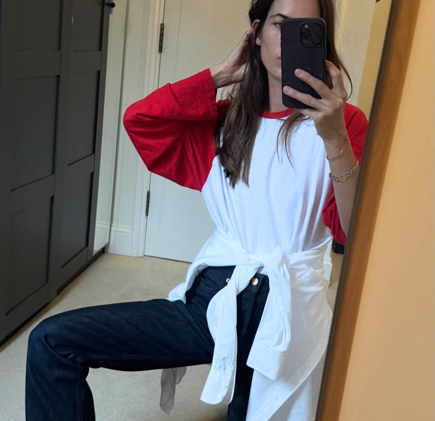 We think the baseball tee in the picture above is Zara (love this Tibi one, too). Zara Contrast Long-Sleeve T-Shirt, $39.90. Size S, M, L.