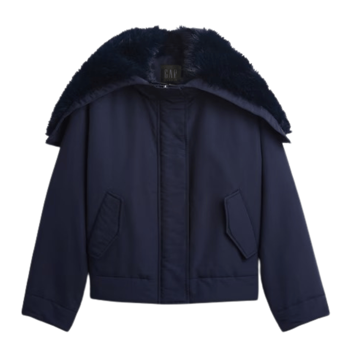 This fashion-y bomber, from Gap’s new higher-end capsule, is finally on-sale.GapStudio Faux Fur-Lined Crop Bomber Jacket, $158. Size XXS to XXL.